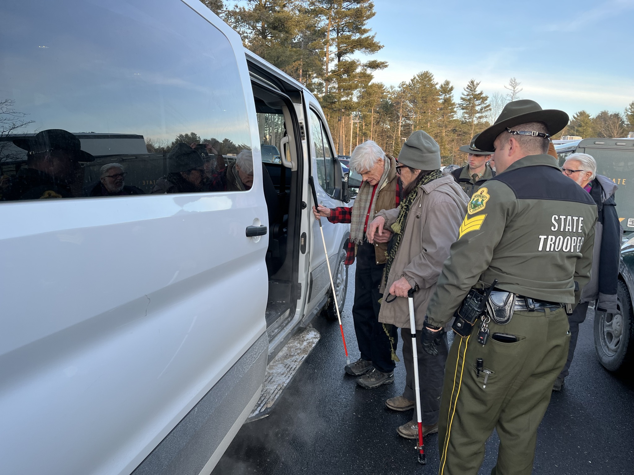Around 2:10 the property manager informed the protesters they would all be given trespass citations and called the police. The Williston police chief came by, smiled and waved, said he was glad we had a sunny day, and then left. State Police arrived around 2:45pm. They set up an area for on-site processing of arrests. Some protesters vacated the building at 3:45pm, while 13 refused to leave. State Police began to issue citations to the remaining protesters at 4:15pm, and then started to load them into waiting vans for transfer to the Williston barracks.